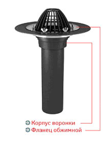 Кровельные воронки с листвоуловителем, обжимным фланцем из нержавеющей стали и вертикальным выпуском используются при устройстве водоотводов с поверхности кровли. Эти воронки применимы для всех типов гидроизоляционных материалов благодаря механическому способу их соединения с кровельным полотном. Воронки кровельные изготовлены из высокопрочного материала, устойчивого к атмосферному воздействию, а также ультрафиолетовому излучению в диапазоне температур от —50 до +80 °С.